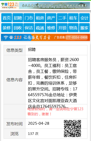 招聘客房服务员,薪资:2600~4000。员工福利:员工宿舍,员工餐,缴纳保险,带薪年假,餐饮折扣,住房折扣,完善的培训体系,足够的晋升空间。招聘专线:17645597576金总地址:伊美区文化宫对面凯理亚森大酒店金总17645597576 【电话咨询时,请一定说明在伊春信息网看到的,谢谢!】 |