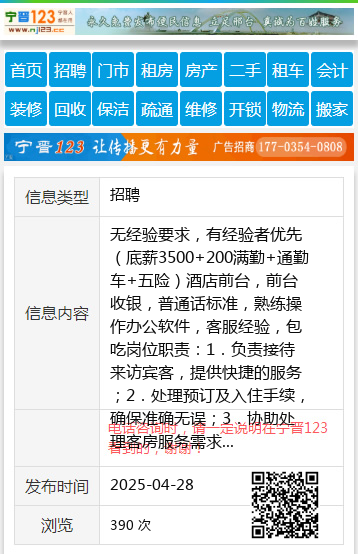 无经验要求,有经验者优先(底薪3500+200满勤+通勤车+五险)酒店前台,前台收银,普通话标准,熟练操作办公软件,客服经验,包吃岗位职责:1.负责接待来访宾客,提供快捷的服务;2.处理预订及入住手续,确保准确无误;3.协助处理客房服务需求,解决客人问题并保持良好的客户关系;4.维护前台区域整洁,执行日常清洁工作。任职要求1.具备优秀的沟通技巧和服务意识;2.熟练操作电脑,有酒店前台工作经验者优先;3.工作责任心强,能适应轮班制度。4.工作时间上一天一宿休一天一宿李15561916767 【电话咨询时,请一定说明在伊春信息网看到的,谢谢!】 |
