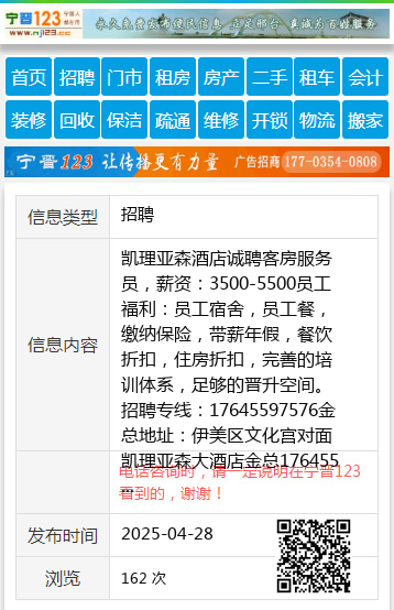 凯理亚森酒店诚聘客房服务员,薪资:3500-5500员工福利:员工宿舍,员工餐,缴纳保险,带薪年假,餐饮折扣,住房折扣,完善的培训体系,足够的晋升空间。招聘专线:17645597576金总地址:伊美区文化宫对面凯理亚森大酒店金总17645597576 【电话咨询时,请一定说明在伊春信息网看到的,谢谢!】 |