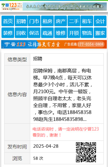 招聘保姆,南郡高层,有电梯。早7晚4点,每天可以休息最少3个小时,活儿不累,月2100元。中午做一顿饭,照顾半自理老太太,老头完全自理,不用管,家里人好,事也少。电话18845835898赵先生18845835898 【电话咨询时,请一定说明在伊春信息网看到的,谢谢!】 |