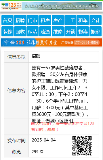 兹有一57岁男性截瘫患者,欲招聘一50岁左右身体健康的护工辅助做康复锻炼,男女不限。工作时间上午7:30至11:30,下午2:00至4:30,6个半小时工作时间,月薪:3700元(其中基础工资3600元+100元满勤奖),地址:傲城小区暖阳13194583030 【电话咨询时,请一定说明在伊春信息网看到的,谢谢!】 |
