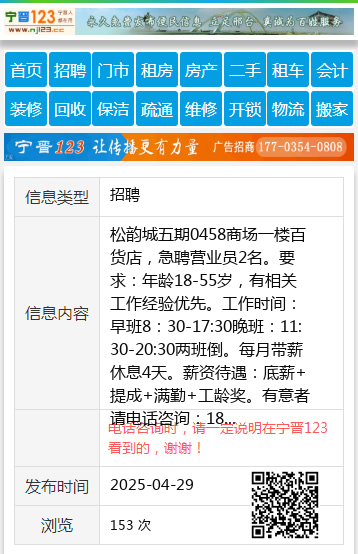 松韵城五期0458商场一楼百货店,急聘营业员2名。要求:年龄18-55岁,有相关工作经验优先。工作时间:早班8:30-17:30晚班:11:30-20:30两班倒。每月带薪休息4天。薪资待遇:底薪+提成+满勤+工龄奖。有意者请电话咨询:1854555575413351488927任女士13351488927 【电话咨询时,请一定说明在伊春信息网看到的,谢谢!】 |