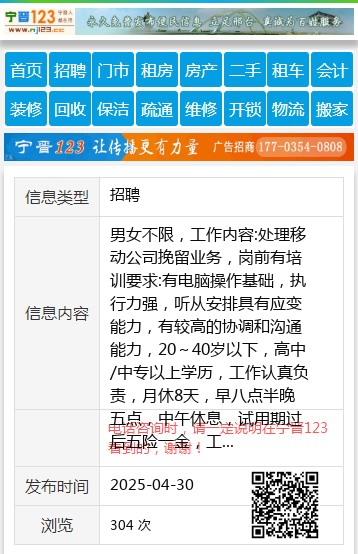 男女不限,工作内容:处理移动公司挽留业务,岗前有培训要求:有电脑操作基础,执行力强,听从安排具有应变能力,有较高的协调和沟通能力,20~40岁以下,高中/中专以上学历,工作认真负责,月休8天,早八点半晚五点,中午休息,试用期过后五险一金,工资待遇:底薪+绩效电话咨询:138959306265月6日后打电话面试工作地点:伊春市移动公司张女士13895930626 【电话咨询时,请一定说明在伊春信息网看到的,谢谢!】 |