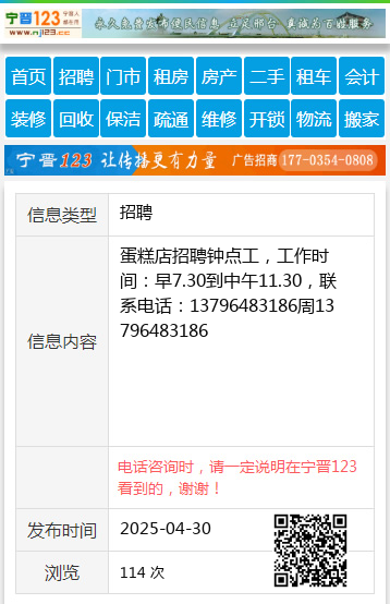 蛋糕店招聘钟点工,工作时间:早7.30到中午11.30,联系电话:13796483186周13796483186