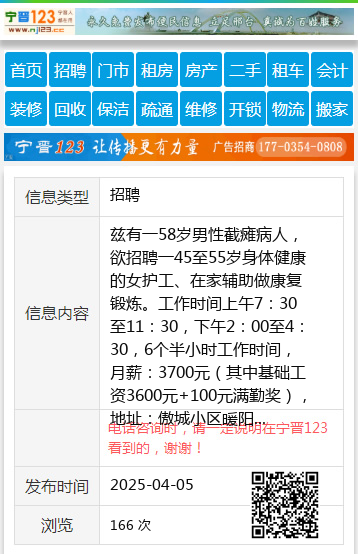 兹有一58岁男性截瘫病人,欲招聘一45至55岁身体健康的女护工、在家辅助做康复锻炼。工作时间上午7:30至11:30,下午2:00至4:30,6个半小时工作时间,月薪:3700元(其中基础工资3600元+100元满勤奖),地址:傲城小区暖阳13194583030 【电话咨询时,请一定说明在伊春信息网看到的,谢谢!】 |