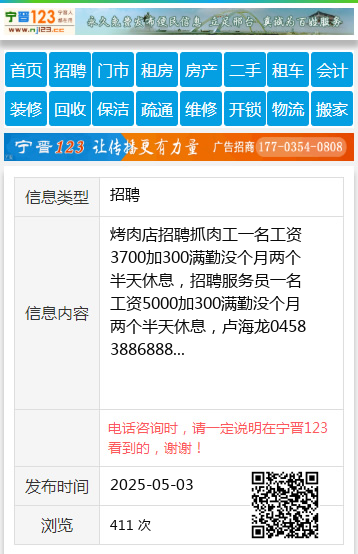 烤肉店招聘抓肉工一名工资3700加300满勤没个月两个半天休息,招聘服务员一名工资5000加300满勤没个月两个半天休息,卢海龙04583886888 【电话咨询时,请一定说明在伊春信息网看到的,谢谢!】 |