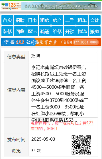 李记老南岗坛肉砂锅伊春店招聘长期员工领班一名工资面议成手砂锅师傅一名工资4500—5000成手面案一名工资4500—5000服务员服务生多名3700到4000洗碗工一名工资3000—3500地址在红旗小区6号楼,黎明小学校北联系电话15636406333招聘钟点工,工作时间,上午10点—下午1点,下午4点到晚上7点,有意者面议电话15636406333张先生15636406333 【电话咨询时,请一定说明在伊春信息网看到的,谢谢!】 |