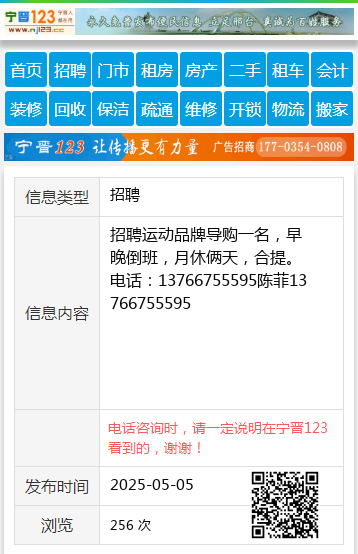 招聘运动品牌导购一名,早晚倒班,月休俩天,合提。电话:13766755595陈菲13766755595