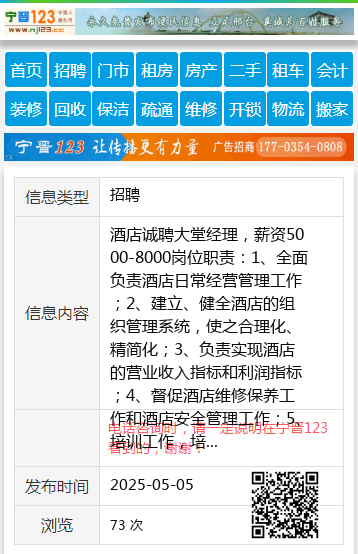 酒店诚聘大堂经理,薪资5000-8000岗位职责:1、全面负责酒店日常经营管理工作;2、建立、健全酒店的组织管理系统,使之合理化、精简化;3、负责实现酒店的营业收入指标和利润指标;4、督促酒店维修保养工作和酒店安全管理工作;5、培训工作,培养人才,提高整个酒店的服务质量和员工素质。任职资格:1、专科以上酒店管理类专业优先;2、具有较强的语言表达能力、人际交往能力、应变能力、沟通能力及解决问题的能力,具备高度的工作热情。于经理18945875538 【电话咨询时,请一定说明在伊春信息网看到的,谢谢!】 |