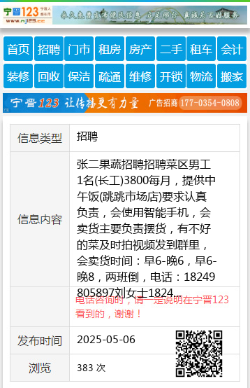 张二果蔬招聘招聘菜区男工1名(长工)3800每月,提供中午饭(跳跳市场店)要求认真负责,会使用智能手机,会卖货主要负责摆货,有不好的菜及时拍视频发到群里,会卖货时间:早6-晚6,早6-晚8,两班倒,电话:18249805897刘女士18249805897 【电话咨询时,请一定说明在伊春信息网看到的,谢谢!】 |
