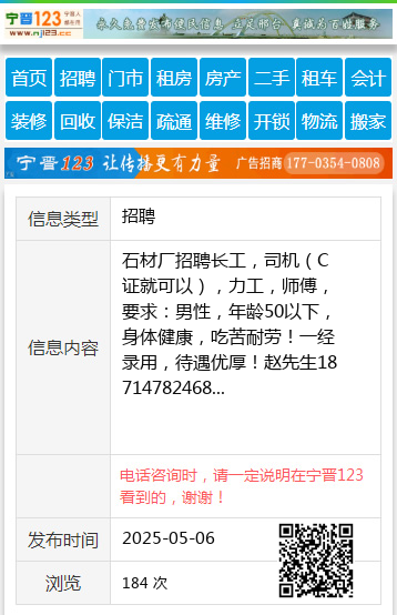 石材厂招聘长工,司机(C证就可以),力工,师傅,要求:男性,年龄50以下,身体健康,吃苦耐劳!一经录用,待遇优厚!赵先生18714782468 【电话咨询时,请一定说明在伊春信息网看到的,谢谢!】 |