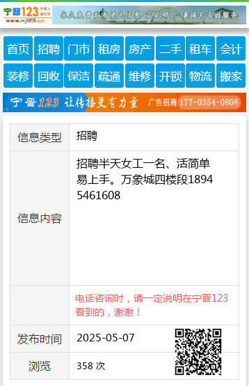 招聘半天女工一名、活简单易上手。万象城四楼段18945461608