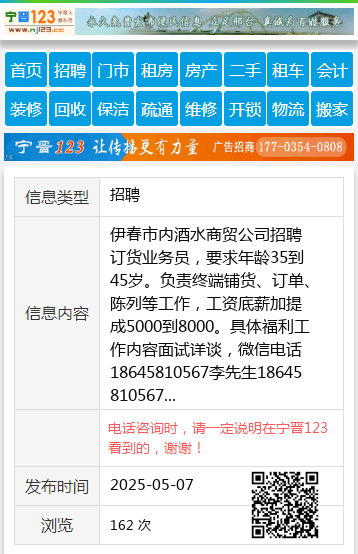 伊春市内酒水商贸公司招聘订货业务员,要求年龄35到45岁。负责终端铺货、订单、陈列等工作,工资底薪加提成5000到8000。具体福利工作内容面试详谈,微信电话18645810567李先生18645810567 【电话咨询时,请一定说明在伊春信息网看到的,谢谢!】 |