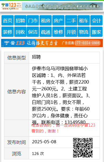 伊春市乌马河绿园翡翠城小区诚聘:1、内、外保洁若干名,男女不限,薪资2200元一2600元。2、土建工程维护人员1名,薪资面议。3、白班门岗1名,男女不限,薪资2500元。要求:年龄60岁以内,身体健康,责任心强。联系电话:1314958007515204594886刘经理13039696677 【电话咨询时,请一定说明在伊春信息网看到的,谢谢!】 |