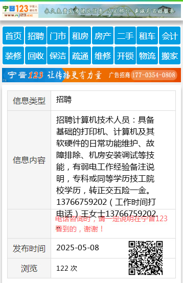 招聘计算机技术人员:具备基础的打印机、计算机及其软硬件的日常功能维护、故障排除、机房安装调试等技能,有弱电工作经验备注说明,专科或同等学历技工院校学历,转正交五险一金。13766759202(工作时间打电话)王女士13766759202 【电话咨询时,请一定说明在伊春信息网看到的,谢谢!】 |