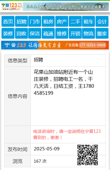 花果山加油站附近有一个山庄装修,招聘电工一名,干几天活,日结工资,王17804585199