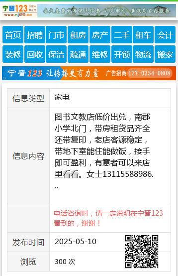 图书文教店低价出兑,南郡小学北门,带房租货品齐全还带复印,老店客源稳定,带地下室能住能做饭,接手即可盈利,有意者可以来店里看看。女士13115588986 【电话咨询时,请一定说明在伊春信息网看到的,谢谢!】 |