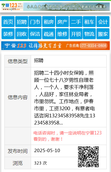 招聘二十四小时女保姆,照顾一位七十八岁男性自理老人,一个人,要求干净利落,人品好,家住林业局者,市里勿扰。工作地点,伊春市里,工资3200,有意者电话咨询13234583958先生13234583958 【电话咨询时,请一定说明在伊春信息网看到的,谢谢!】 |