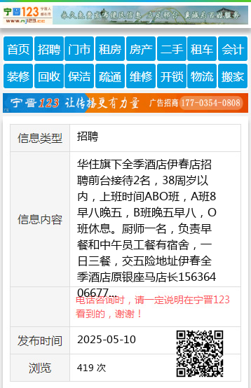 华住旗下全季酒店伊春店招聘前台接待2名,38周岁以内,上班时间ABO班,A班8早八晚五,B班晚五早八,O班休息。厨师一名,负责早餐和中午员工餐有宿舍,一日三餐,交五险地址伊春全季酒店原银座马店长15636406677 【电话咨询时,请一定说明在伊春信息网看到的,谢谢!】 |