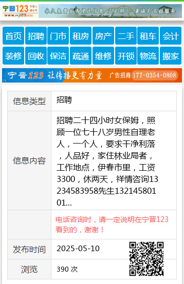 招聘二十四小时女保姆,照顾一位七十八岁男性自理老人,一个人,要求干净利落,人品好,家住林业局者,工作地点,伊春市里,工资3300,休两天,祥情咨询13234583958先生13214580101 【电话咨询时,请一定说明在伊春信息网看到的,谢谢!】 |