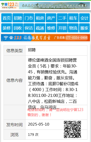 德伦堡啤酒全国连锁招聘营业员(5名)要求:年龄30-45,有销售经验优先。沟通能力强,勤奋,服从安排。工资待遇:底薪➕餐补➕提成(4000)工作时间:8:30-18:3011:00-21:00工作地址:八中店,松韵新城店,二百货店,乌马河店老板人好事少,有意电联笑笑18345888737 【电话咨询时,请一定说明在伊春信息网看到的,谢谢!】 |
