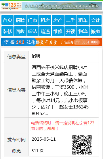 河西林干校米线店招聘小时工或全天煮面勤杂工,煮面勤杂工每月一天带薪休假,供两顿饭,工资3500,小时工中午三小时,晚上三小时,每小时14元,店小老板事少,活好干!赵女士13624580452 【电话咨询时,请一定说明在伊春信息网看到的,谢谢!】 |