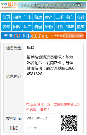 招聘垃圾清运员要求:能够吃苦耐劳,爱岗敬业,身体健康待遇:面议栾站长19604581826
