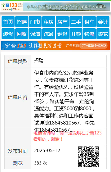 伊春市内商贸公司招聘业务员,负责终端订货陈列等工作。有经验优先,没经验肯干的有人带。要求年龄35到45岁,踏实能干有一定的沟通能力。工资5000到8000,具体福利待遇和工作内容面试详谈18645810567。李先生18645810567 【电话咨询时,请一定说明在伊春信息网看到的,谢谢!】 |