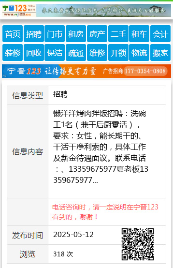 懒洋洋烤肉拌饭招聘:洗碗工1名(兼干后厨零活),要求:女性,能长期干的、干活干净利索的,具体工作及薪金待遇面议。联系电话:、13359675977夏老板13359675977 【电话咨询时,请一定说明在伊春信息网看到的,谢谢!】 |