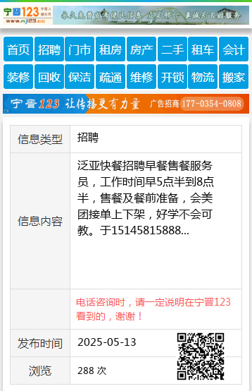 泛亚快餐招聘早餐售餐服务员,工作时间早5点半到8点半,售餐及餐前准备,会美团接单上下架,好学不会可教。于15145815888 【电话咨询时,请一定说明在伊春信息网看到的,谢谢!】 |