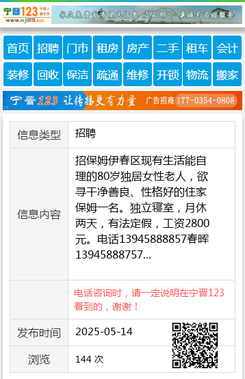 招保姆伊春区现有生活能自理的80岁独居女性老人,欲寻干净善良、性格好的住家保姆一名。独立寝室,月休两天,有法定假,工资2800元。电话13945888857春晖13945888757 【电话咨询时,请一定说明在伊春信息网看到的,谢谢!】 |