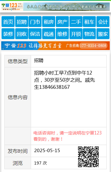招聘小时工早7点到中午12点,30岁至50岁之间。戚先生13846638167
