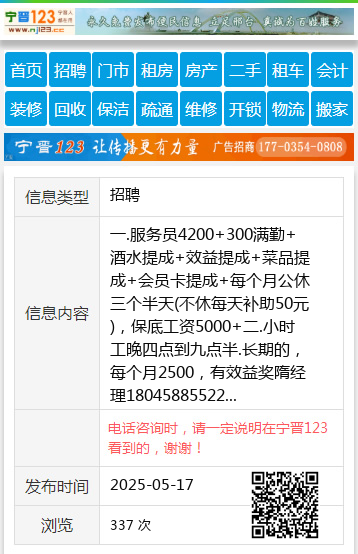 一.服务员4200+300满勤+酒水提成+效益提成+菜品提成+会员卡提成+每个月公休三个半天(不休每天补助50元),保底工资5000+二.小时工晚四点到九点半.长期的,每个月2500,有效益奖隋经理18045885522 【电话咨询时,请一定说明在伊春信息网看到的,谢谢!】 |