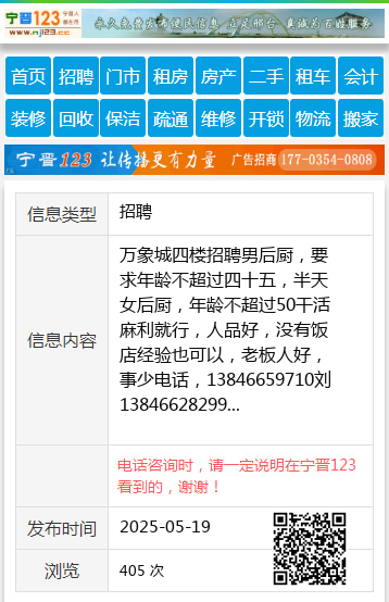 万象城四楼招聘男后厨,要求年龄不超过四十五,半天女后厨,年龄不超过50干活麻利就行,人品好,没有饭店经验也可以,老板人好,事少电话,13846659710刘13846628299 【电话咨询时,请一定说明在伊春信息网看到的,谢谢!】 |