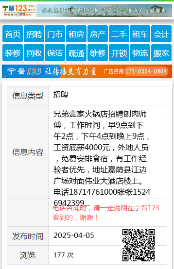 兄弟壹家火锅店招聘刨肉师傅,工作时间,早9点到下午2点,下午4点到晚上9点,工资底薪4000元,外地人员,免费安排食宿,有工作经验者优先,地址嘉荫县江边广场对面伟业大酒店楼上。电话18714761000张张15246942399 【电话咨询时,请一定说明在伊春信息网看到的,谢谢!】 |