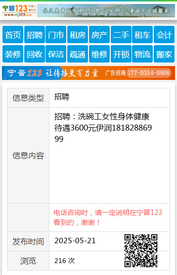 招聘:洗碗工女性身体健康待遇3600元伊润18182886999