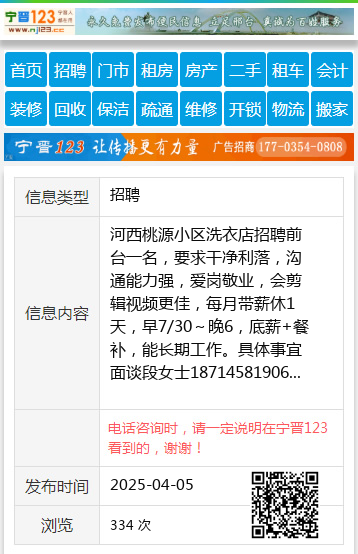 河西桃源小区洗衣店招聘前台一名,要求干净利落,沟通能力强,爱岗敬业,会剪辑视频更佳,每月带薪休1天,早7/30~晚6,底薪+餐补,能长期工作。具体事宜面谈段女士18714581906 【电话咨询时,请一定说明在伊春信息网看到的,谢谢!】 |