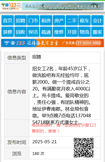 招女工2名,年龄45岁以下,做洗脸吧有无经验均可,底薪2000。做一个提成百分之20。有满勤奖月收入4000以上。充卡提成。爱岗敬业的,责任心强,有团队精神的。地址伊春南郡。林业局包食宿。早9点晚7点电话13704854718联系方式潘女士18004586778