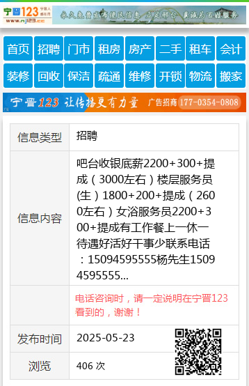 吧台收银底薪2200+300+提成(3000左右)楼层服务员(生)1800+200+提成(2600左右)女浴服务员2200+300+提成有工作餐上一休一待遇好活好干事少联系电话:15094595555杨先生15094595555 【电话咨询时,请一定说明在伊春信息网看到的,谢谢!】 |