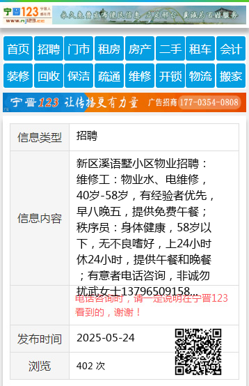 新区溪语墅小区物业招聘:维修工:物业水、电维修,40岁-58岁,有经验者优先,早八晚五,提供免费午餐;秩序员:身体健康,58岁以下,无不良嗜好,上24小时休24小时,提供午餐和晚餐;有意者电话咨询,非诚勿扰武女士13796509158