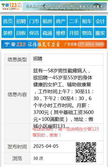 兹有一58岁男性截瘫病人,欲招聘一45岁至55岁的身体健康的女护工、辅助做康复,工作时间上午7:30至11:30,下午2:00至4:30,6个半小时工作时间。月薪:3700元(其中基础工资3600元+100满勤奖),地址:傲城小区暖阳13194583030 【电话咨询时,请一定说明在伊春信息网看到的,谢谢!】 |