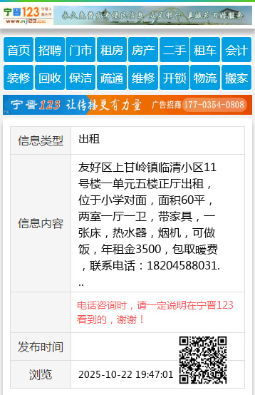 友好区上甘岭镇临清小区11号楼一单元五楼正厅出租,位于小学对面,面积60平,两室一厅一卫,带家具,一张床,热水器,烟机,可做饭,年租金3500,包取暖费,联系电话:18204588031 【电话咨询时,请一定说明在伊春信息网看到的,谢谢!】 |